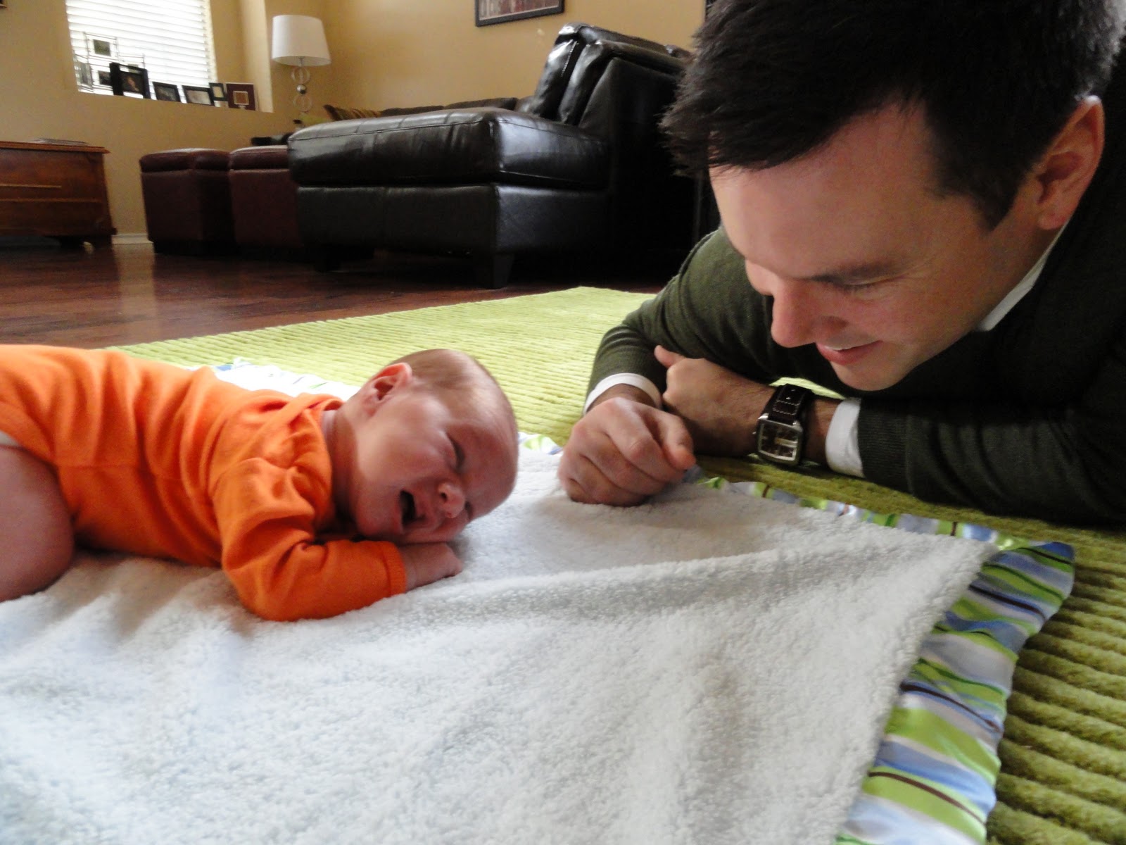 | Tummy time — first attempt. Couldn’t quite get our head up (despite lots of encouragement from Dad!) |