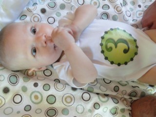 A couple weeks ago, the little guy found his hands. He is insanely fascinated by them. He often holds them together like so and whacks himself in the face with them. He’s nuts.