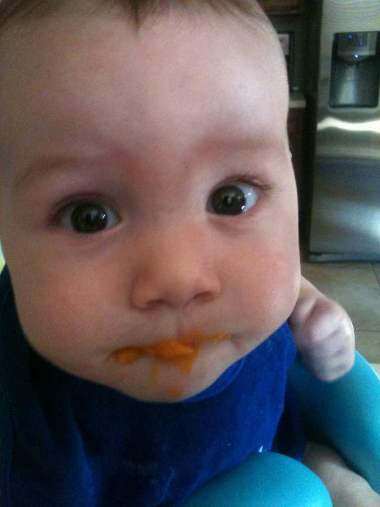 Also in the midst of this madness, I’ve started Walt on solid foods. He has two little bottom teeth. I had planned to wait until six months, but Walt truly shows an interest in eating big people food. Done and done. We tried rice cereal and after two times, he had the process down pat. I also made some sweet potatoes, which he gobbled up.