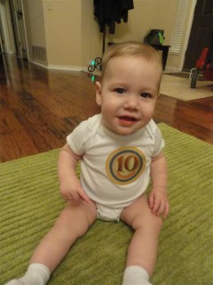 Walt is already in double digits?! Wow.  I’m in shock. It feels like I was pregnant just yesterday (though part of me feels like that was a totally different life).  We now have a full-fledged mover who is the coolest, funniest, happiest, sweetest little thing in our lives.  At 10 months, Walt does the following: