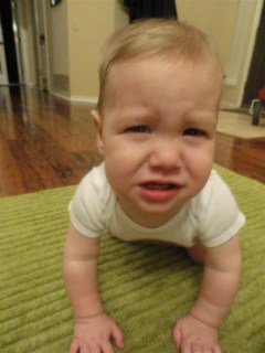 2. Pulling up:  About 60 seconds after figuring out the crawling thing, Walt realized he could get into more things on his feet. He often makes a beeline to electrical outlets, breakables, or anything that could potentially cause choking or stitches.