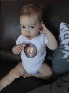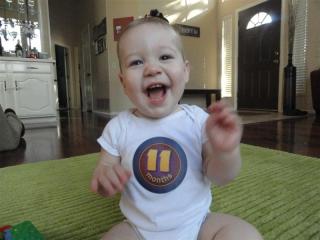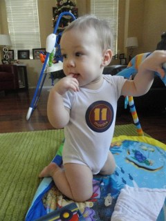 - Eating — he still takes 4 6-oz bottles a day, but we’re getting better at table food. He loves grilled cheese, string cheese, graham crackers, and pizza. He’s a carbie, like me 🙂