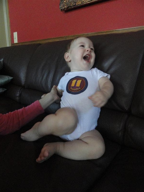 - Talking — Walt is starting to try and say things while pointing. He points at EVERYTHING. He often uses this as a means of bossing us around. He can point at me, point at a light switch, grunt a couple times and I know that means he wants the light on. He also loves to point at his friends. The word he probably says the most is “uh-oh” and it’s usually preemptive (he’ll say uh-oh THEN drop his sippy cup on the floor).