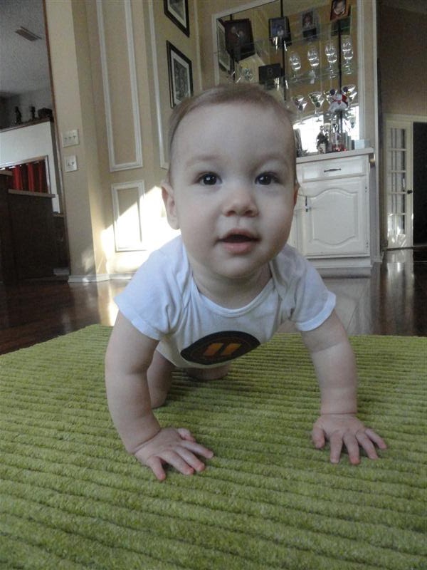 - Crawling/Standing — he is the speediest little crawler and loves to pull up on things. Lately he will let go of what he’s pulled up on, cut his eyes to me, then laugh. He’s a little show off ! He hasn’t made any attempts to move (walk) while standing alone. Like my other mommy friends, I’m a-okay with this!