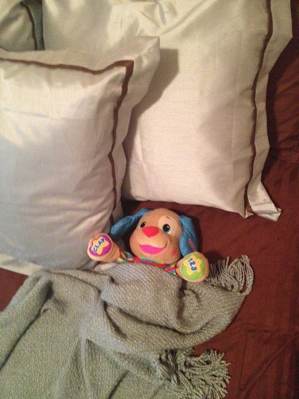 | After their fun stay, I found puppy nicely tucked away in the guest bed. He’s still there 🙂 |