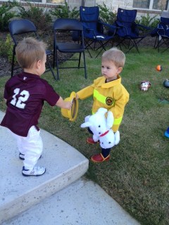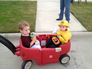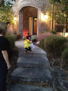 Our neighbors, the Allens, has a fun little gathering in their front yard starting in the late afternoon. It was perfect for all our little toddlers considering It doesn’t get dark til nearly 7:00 and that’s Walt’s normal bedtime. So, the kids had a blast just running around in their costumes. And we still got to do some traditional trick or treating, which Walt TOTALLY figured out. After one house he was marching up to the door, ringing doorbells, and saying “chick a cheek”. He even managed a few “thank yous” in there, so I’m a happy mama.