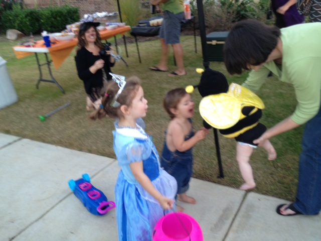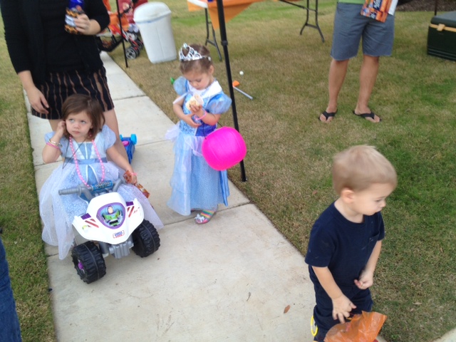 Our neighbors, the Allens, has a fun little gathering in their front yard starting in the late afternoon. It was perfect for all our little toddlers considering It doesn’t get dark til nearly 7:00 and that’s Walt’s normal bedtime. So, the kids had a blast just running around in their costumes. And we still got to do some traditional trick or treating, which Walt TOTALLY figured out. After one house he was marching up to the door, ringing doorbells, and saying “chick a cheek”. He even managed a few “thank yous” in there, so I’m a happy mama.