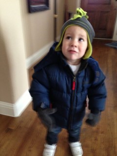 | Thank goodness Santa brought him a hat and mittens (but this puffy jacket cracks me up the most) |