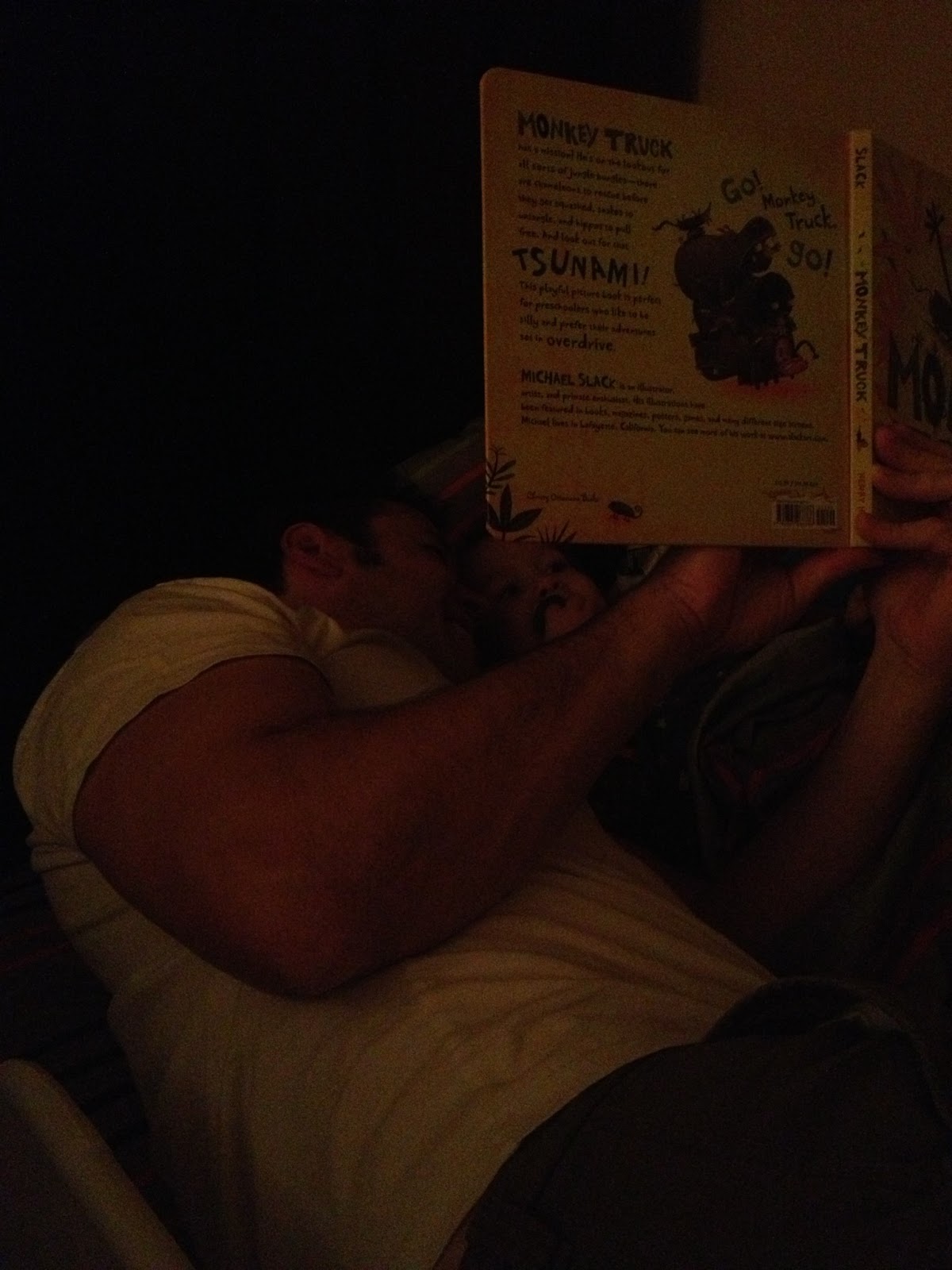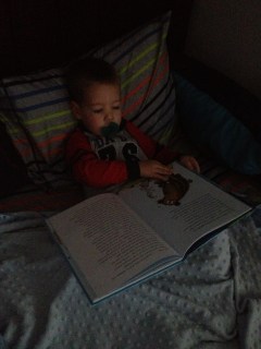 This was one morning this past weekend. Walt grabbed a book and was reading. Victory!  (Don’t judge us for the paci… one transition at a time, people).