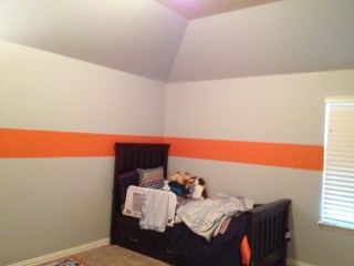 And here’s a little preview of his new room. Blue-gray walls with a  rad orange stripe.  We have the rest of the bedroom furniture and some other projects to complete this. Stay tuned 🙂