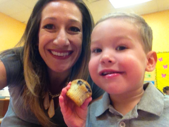 I got to celebrate Mother’s Day in Walt’s adorable little classroom. I sat at a little table on a little chair just like he does every day. (Let me just tell you how well this 7.5month pregnant mama fit in that teeny tiny chair…). We ate muffins together (yes, Walt actually ate a muffin… at least he licked the top). And he gave me a homemade gift.