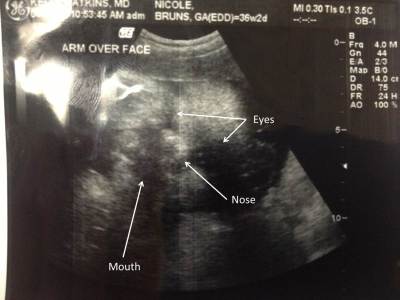 While I had a sono, it’s tough to see this guy. The sonographer commented that he doesn’t have much room. In the picture, you really have to use your imagination. I tried to help you out. She did say they saw fuzzy little hair on his head!