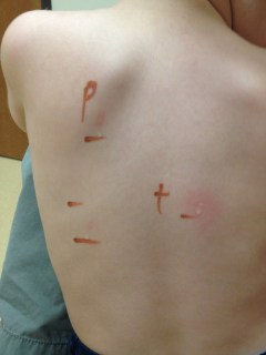 We took Walt to Dr. Moore this week to get re-tested. Many kids can grow out of the allergy by the time they are five years old, but this is really the only way to tell, without causing anaphylaxis. Since we practice “total avoidance”, we really had no idea if the allergy was still present. Welp, it is. 🙂 You’re either allergic or you’re not, but they do grade the reaction. Walt is a 3, which is supposedly pretty sensitive.
