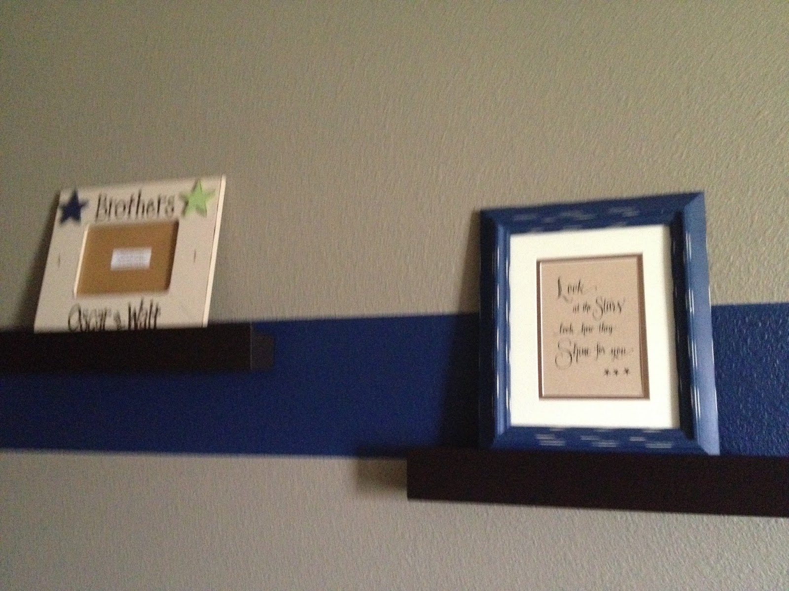 | Sorry for the blurry pic. I was holding a squirmy Stinks boy. Frames on the wall. Upper left needs a pic, from Stori and the print on the right is handwritten by Heather “Look t the stars, look how they shine for you” |