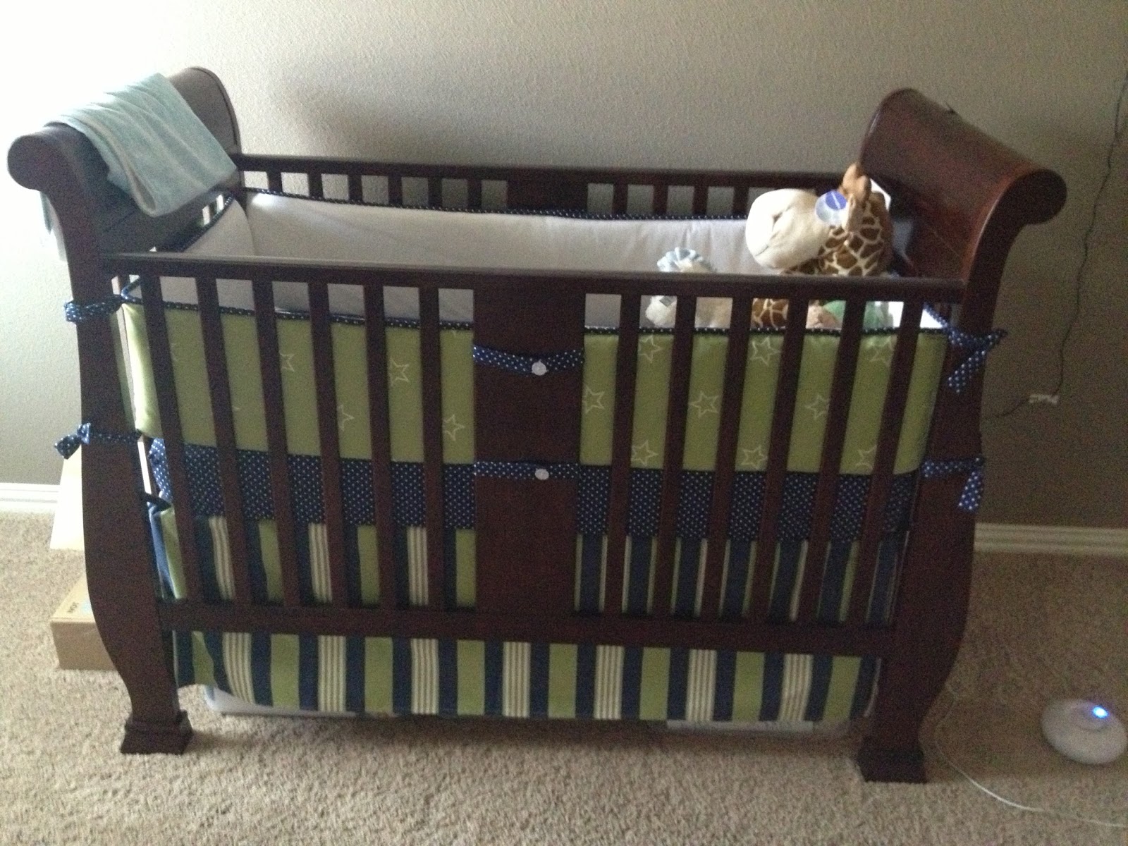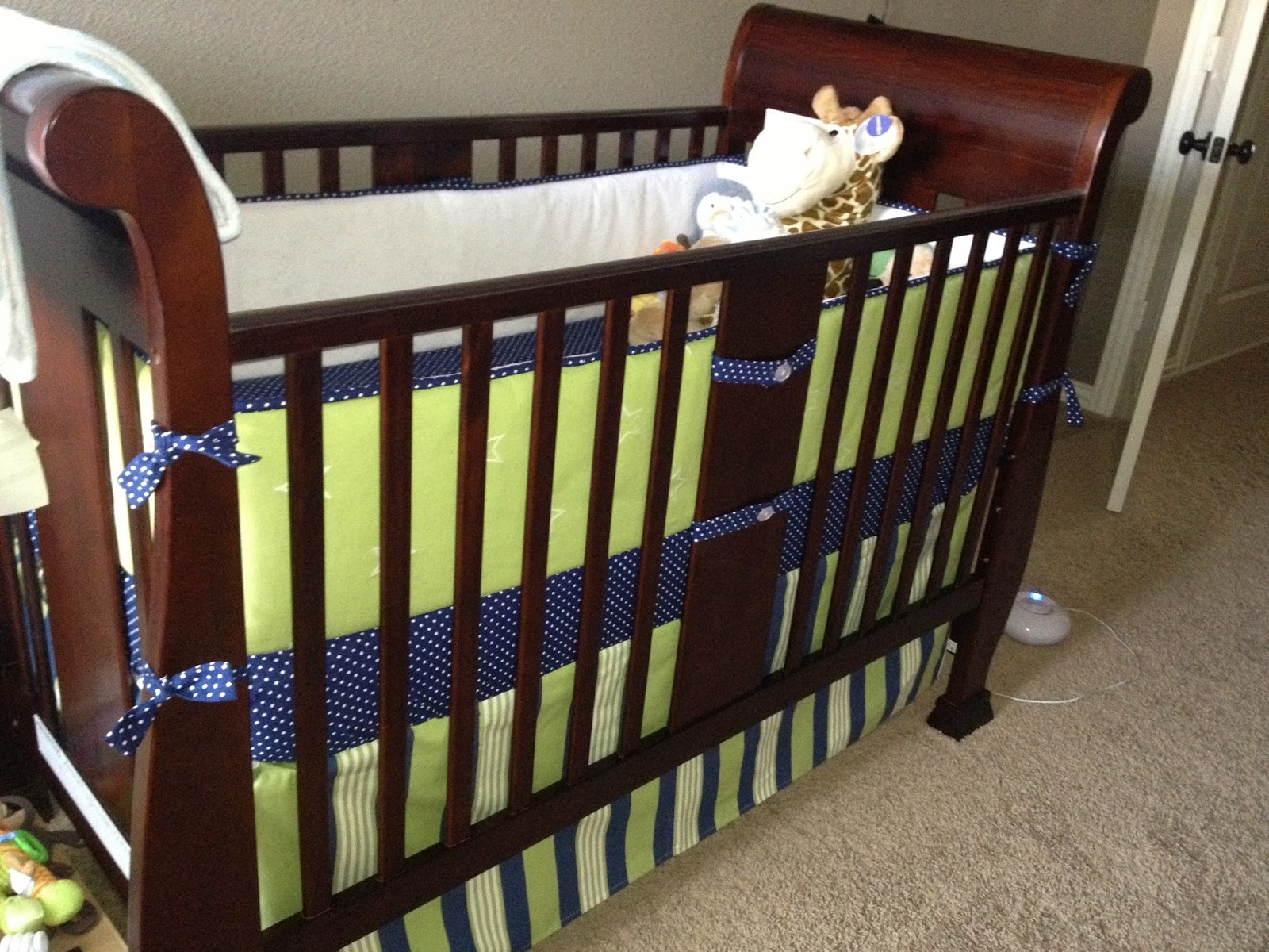 | Shot #1 of crib. It’s Walt’s crib, but the bedding is new. Navy and lime green. The bumper has little white stars on it. |