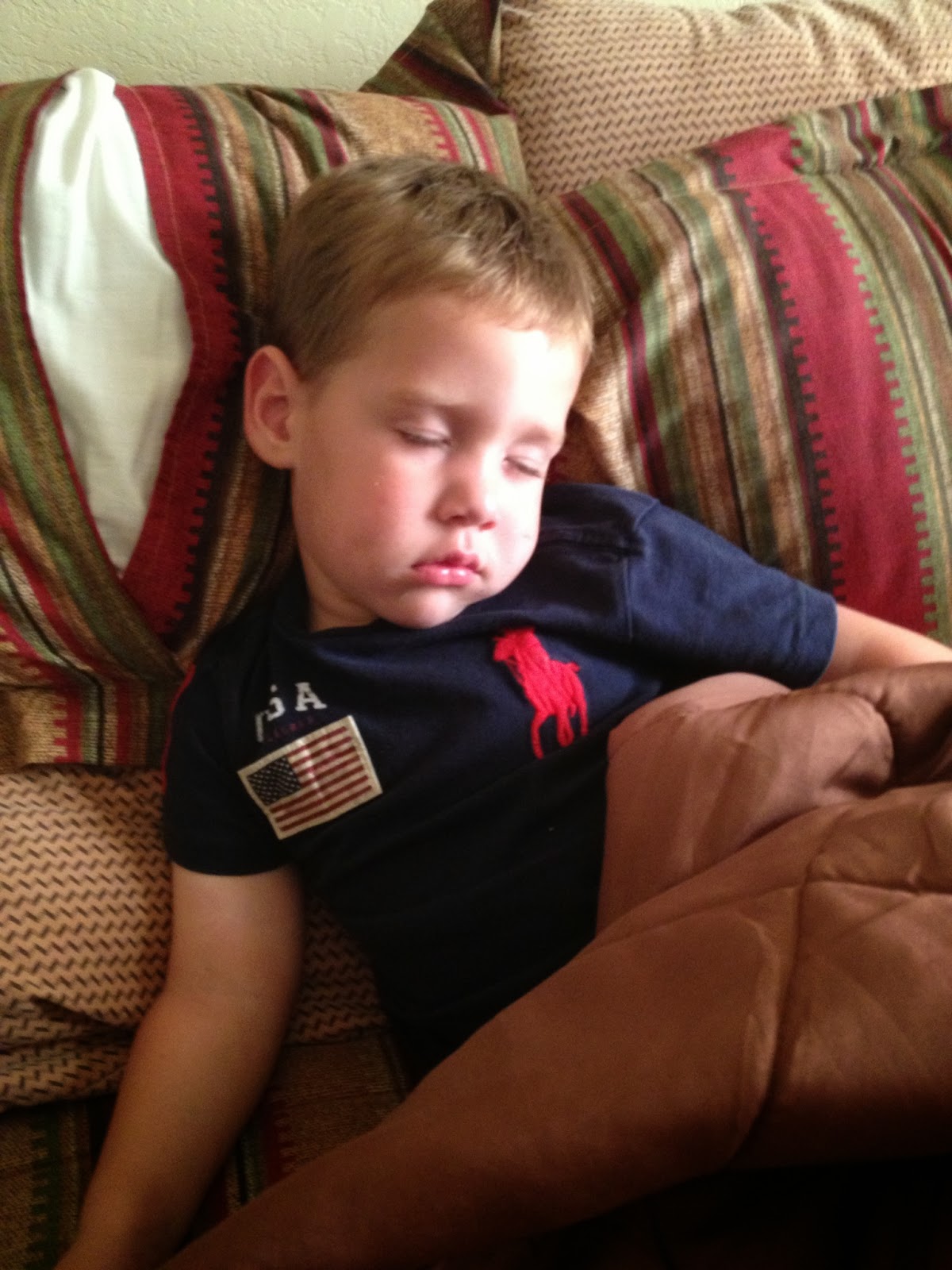 And then on Saturday night, this happened. My poor little Munkaman had more fun than he could handle. He went to a back bedroom to watch some cartoons, and by 6:15, I found him like this: