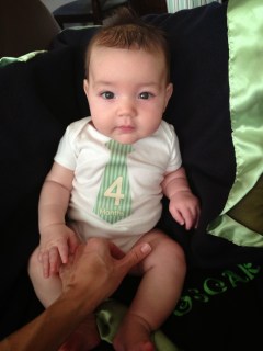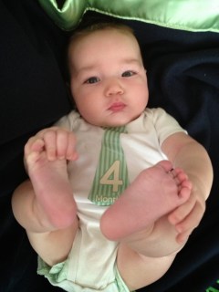 - Rolling! – a couple weeks ago Stinks rolled from his back to his tummy. We thought for sure it was an accident. Now he rolls within 10 secs of placing him on his back… including to sleep. Turns out, he sleeps a lot better on his tummy 🙂 (I know, I know… “Back to Sleep” and “Back is Best” yada yada, but we got the green light from Dr. G b/c O is so strong).