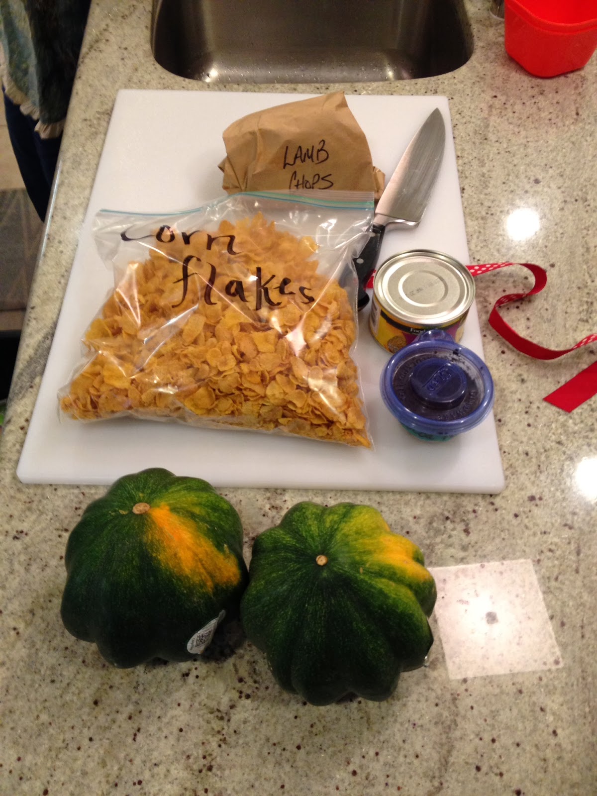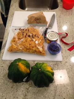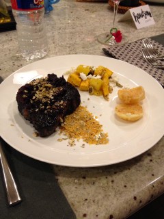 | The girls’ dish: A coffee/cocoa rubbed lamb chop on a bed of corn flakes/pumpkin seeds, with a side of roasted acorn squash, pumpkin seeds, and goat cheese. All served with a side of cheese bread.