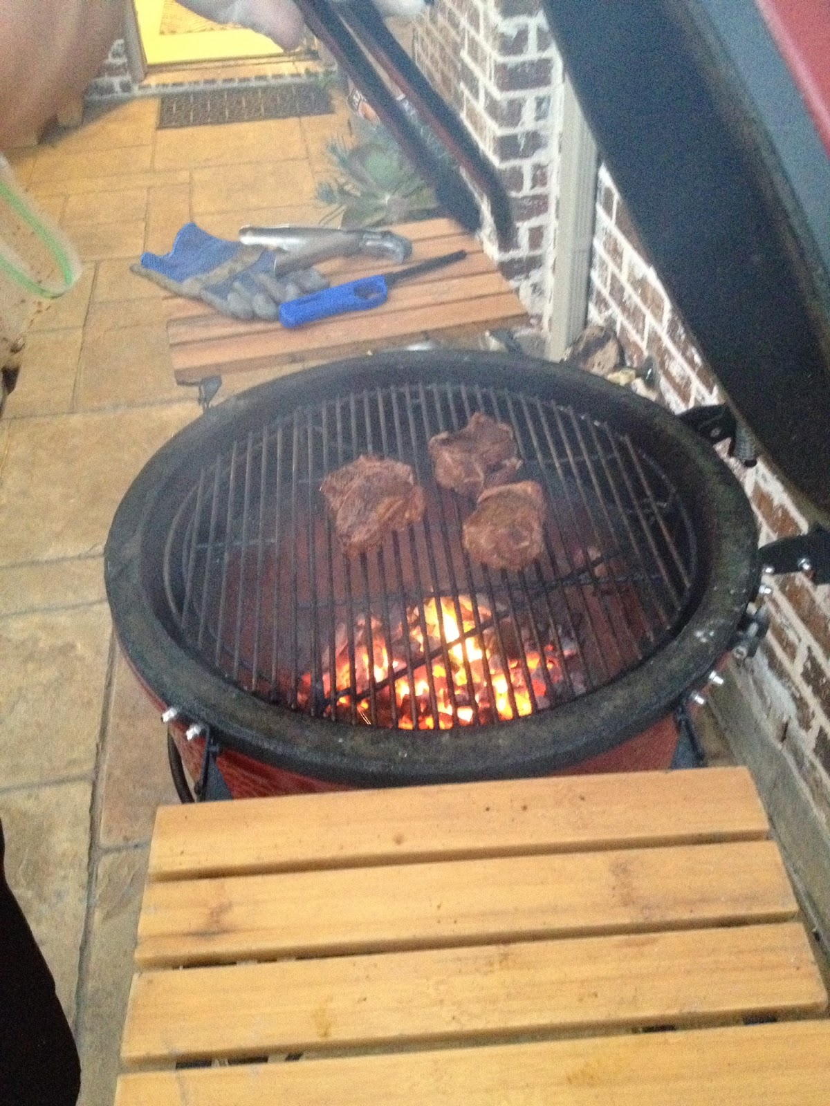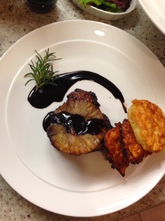| The boys served a grilled lamb chop with balsamic/mole sauce topped with a grilled pineapple, and serve with tempura pineapple and squash (tempura batter included corn flakes).