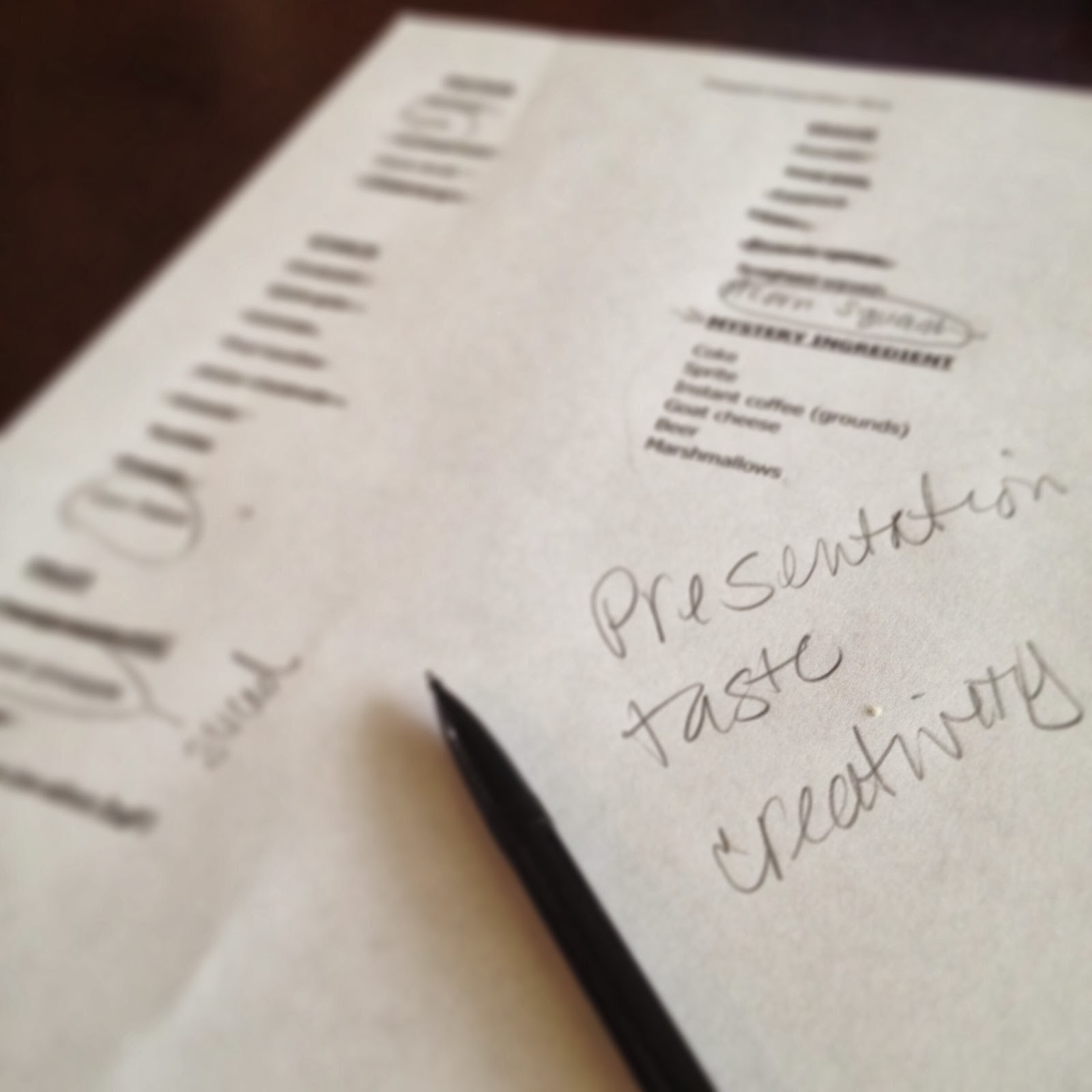 Chris and I took our role as judges very seriously. We had a long list of ingredients that we narrowed down to 5 (the major categories and a mystery ingredient):