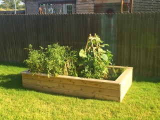 | Our flourishing garden. Tomatoes on the far left, cucumbers on the vine, and bell and Jalepeno peppers in front. |