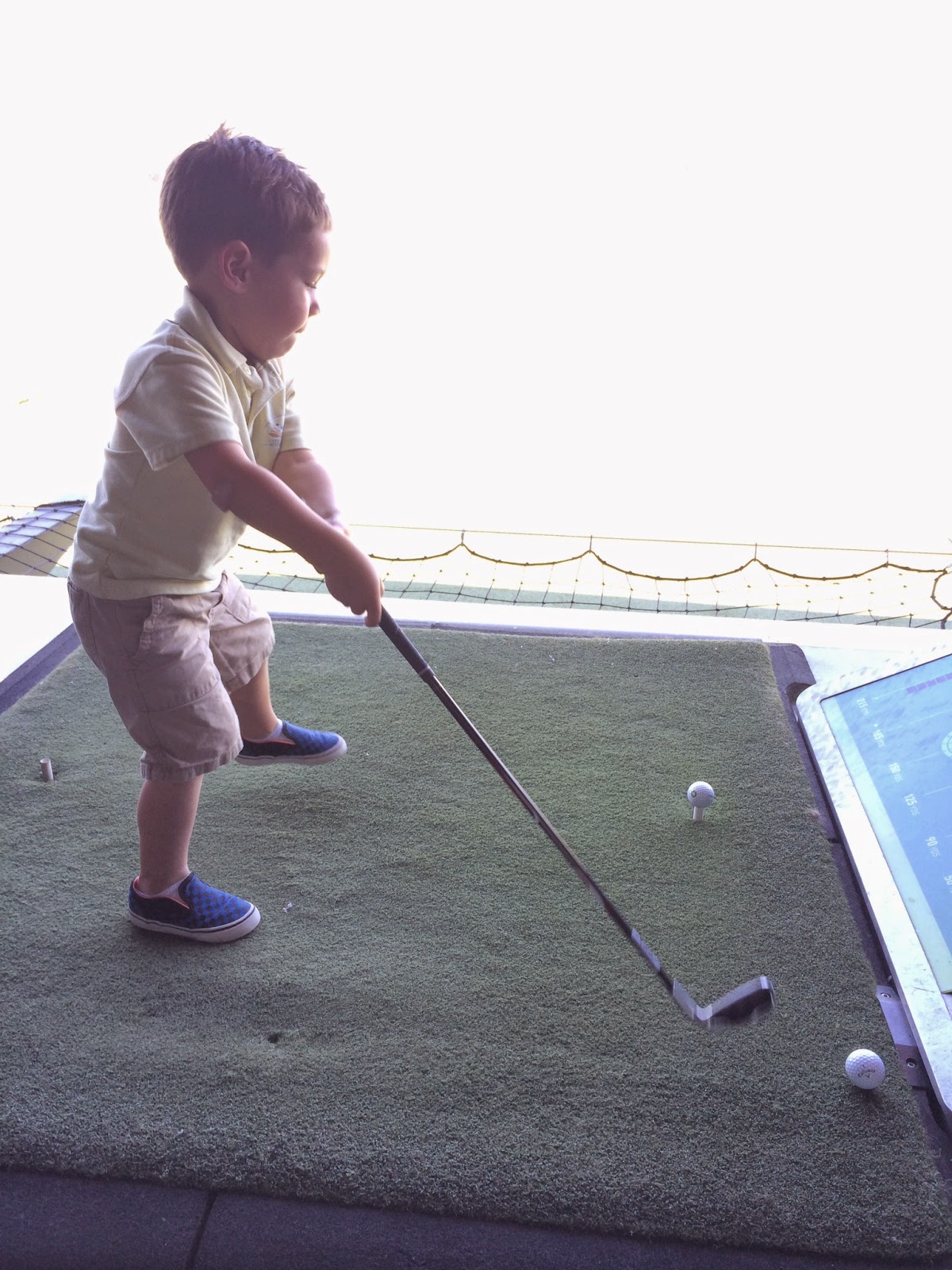 We are so thankful that Chris has a flexible schedule, because it allows him to find some extra bonding time with the boys. Especially during the summer when I feel ultra guilty that they have to go to school every day.  One day, Chris decided to pick Walt up a little early and take him to Top Golf. I’ll admit, I thought the activity seemed ambitious. Walt isn’t even four years old yet.  He does have a couple real golf clubs (a putter and a driver), but we rarely have the chance to actually use them.