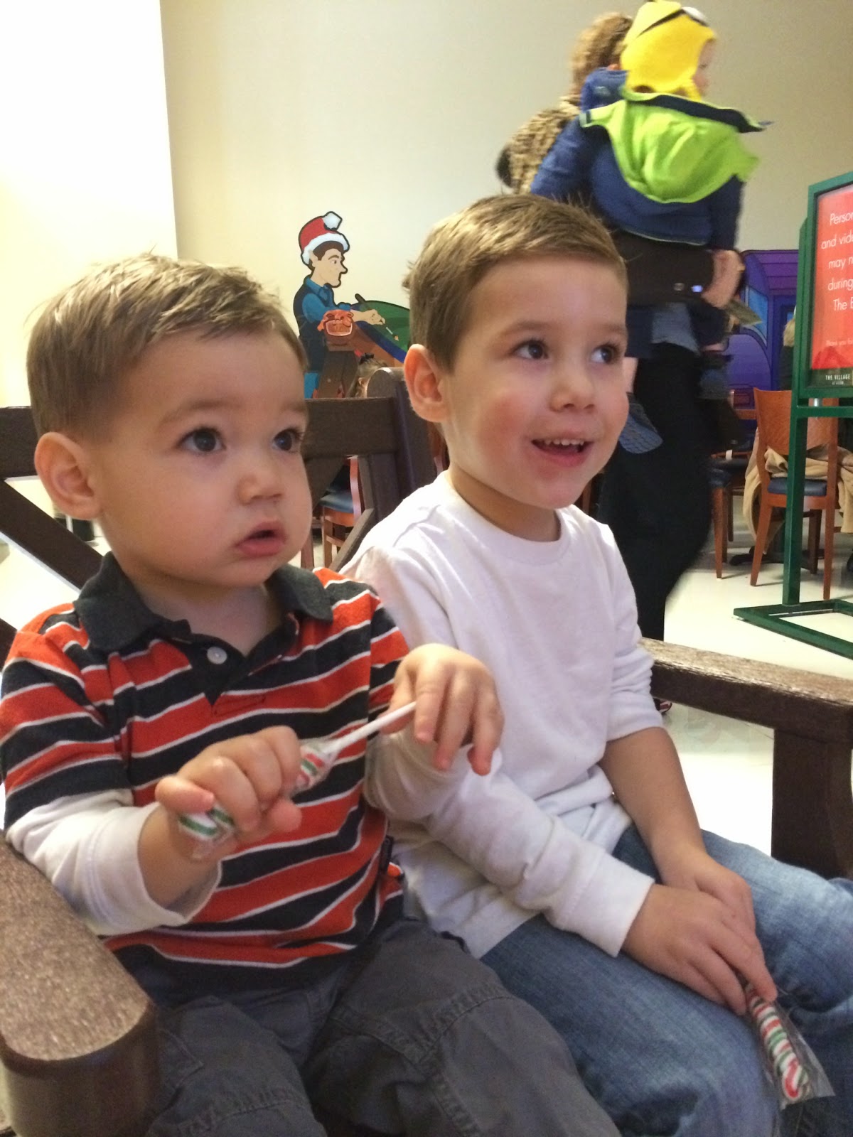 The whole way over, Oscar kept saying “Santa!” and pointing to Santa pics. As soon as we walked in the door, his grip on me tightened. As we got closer to Santa, I could have let go of Oscar and he would have stayed firmly affixed to my hip. That’s how tightly he was holding me.