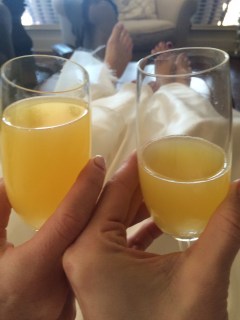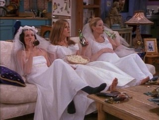 | In case you forgot the episode, here are the Friends’ girls sitting like normal people in their wedding dresses…drinkng. |