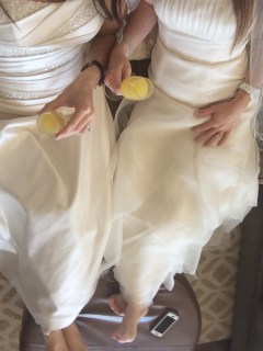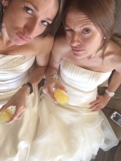 | Keeping it real in our wedding dresses. |