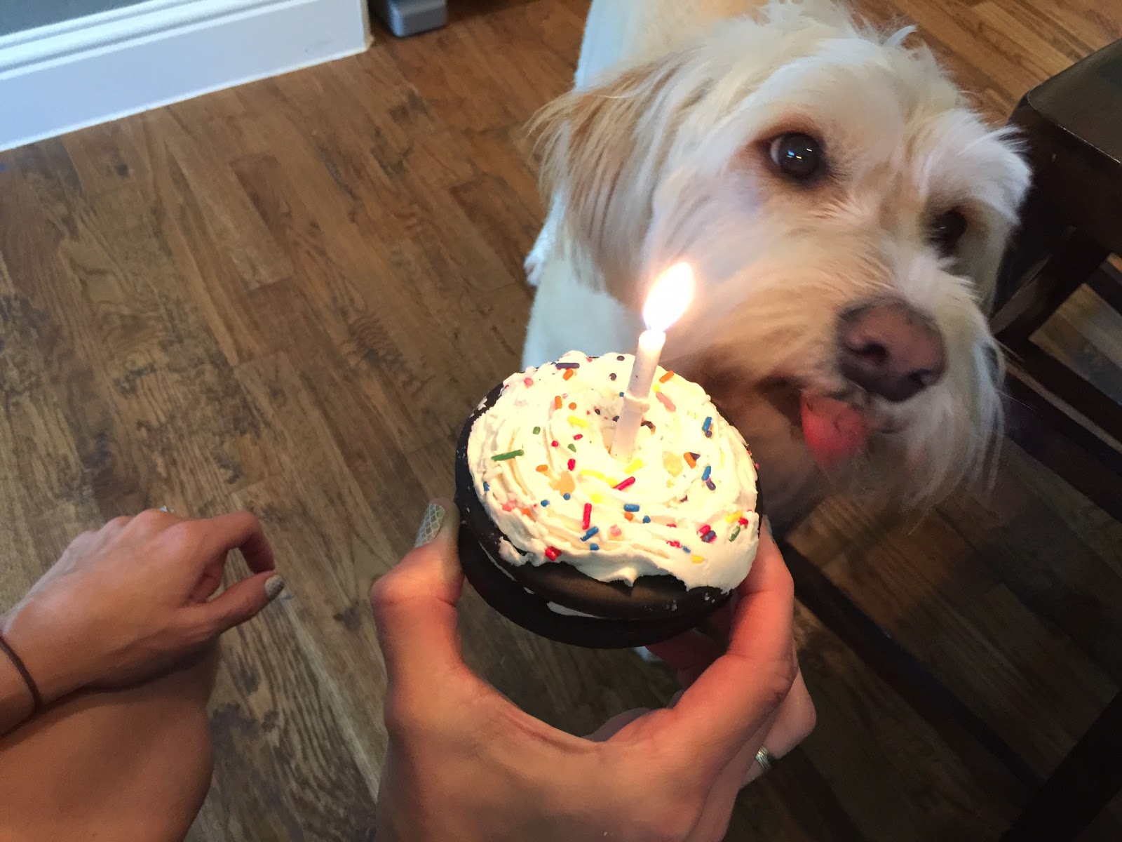 To celebrate our furriest family member, I bought him a doggie whoopie pie and we all sang Happy Birthday!