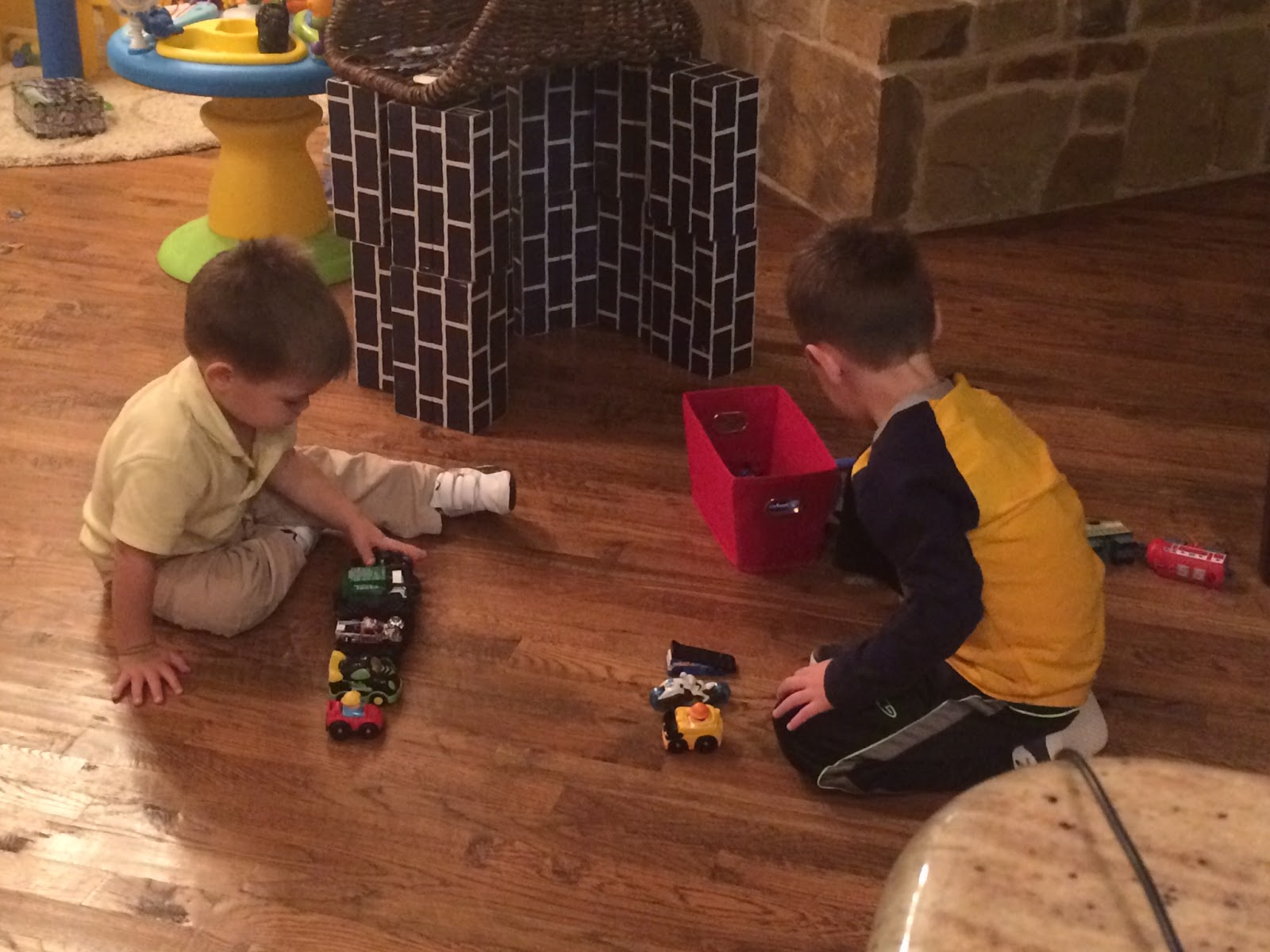 | Cars are a big source of unity in our house. Look how Oscar lined them all up! |
