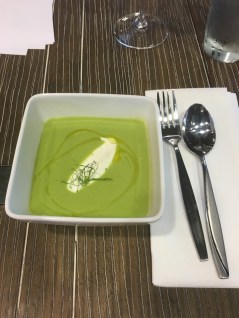 | First course: Chilled green cauliflower soup with Texas goat cheese. Spoiler alert: the perfect green color comes from a tiny bit of spinach pureed and mixed in. |