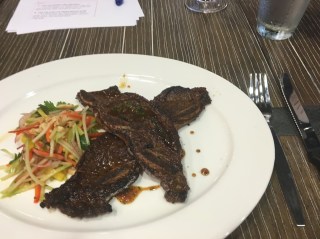 | Main course: Gal-Bi short ribs (with Thai chilis – hot!) and a chayote-green mango slaw. The slaw was a fabulous combo of sweet and spicy and those short ribs…woah…. Even Kent was drooling over them! |