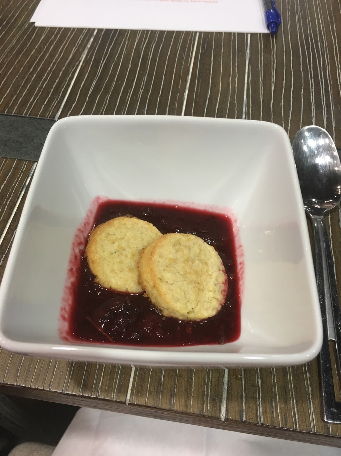 | And let us not forget dessert! Citrus shortbread cookies with a blackberry-rhubarb compote. This dessert leaned more citrus than sweet so it was the perfect end to that spicy dinner. Bonus: the cookies are EGG FREE! I can’t wait to make these! |