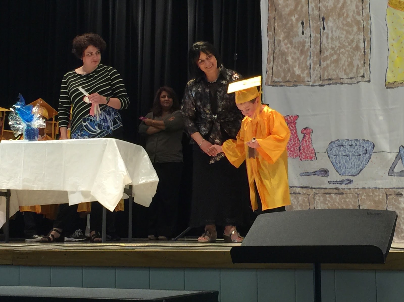 Here he is, walking across the stage and getting his hard-earned (!) diploma from his beloved teacher, Ms. Farah.