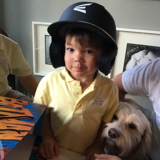 | Did you notice the baseball helmet?? This might have taken the cake. Oscar absolutely loves wearing Walt’s helmet and now has one of his own. |