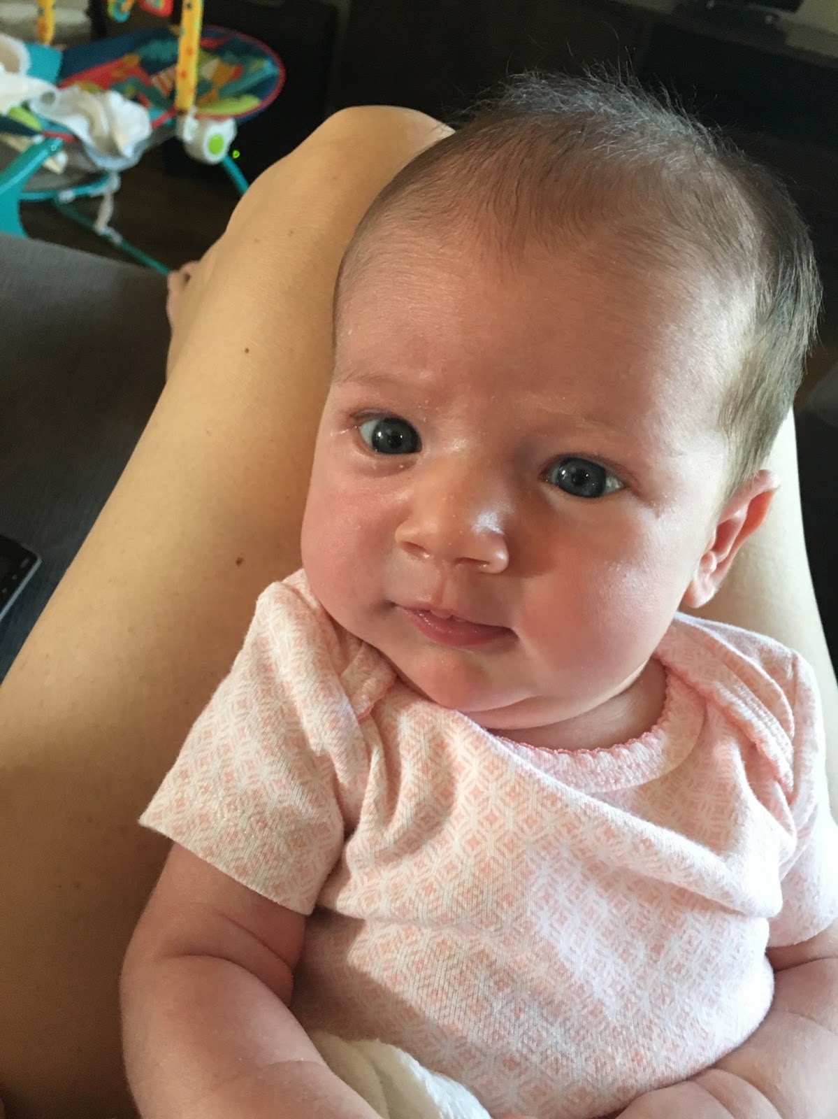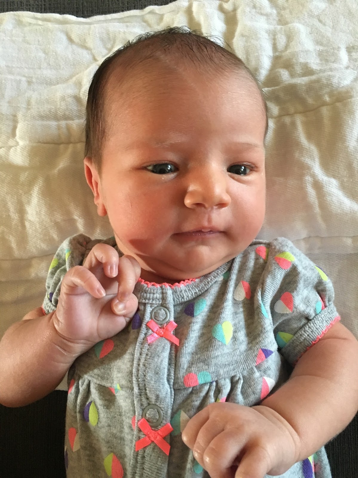 She’s not smiling just yet (FYI – Oscar was smiling by 4 weeks and Walt took closer to 5-6 weeks), but she’s close. She’s given us a few half smiles and definitely happy faces. We’re ready for the full-face smile! Also, she has a this precious dimple on her left cheek that I’m ready to show off!
