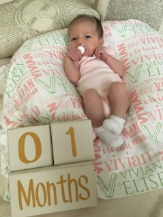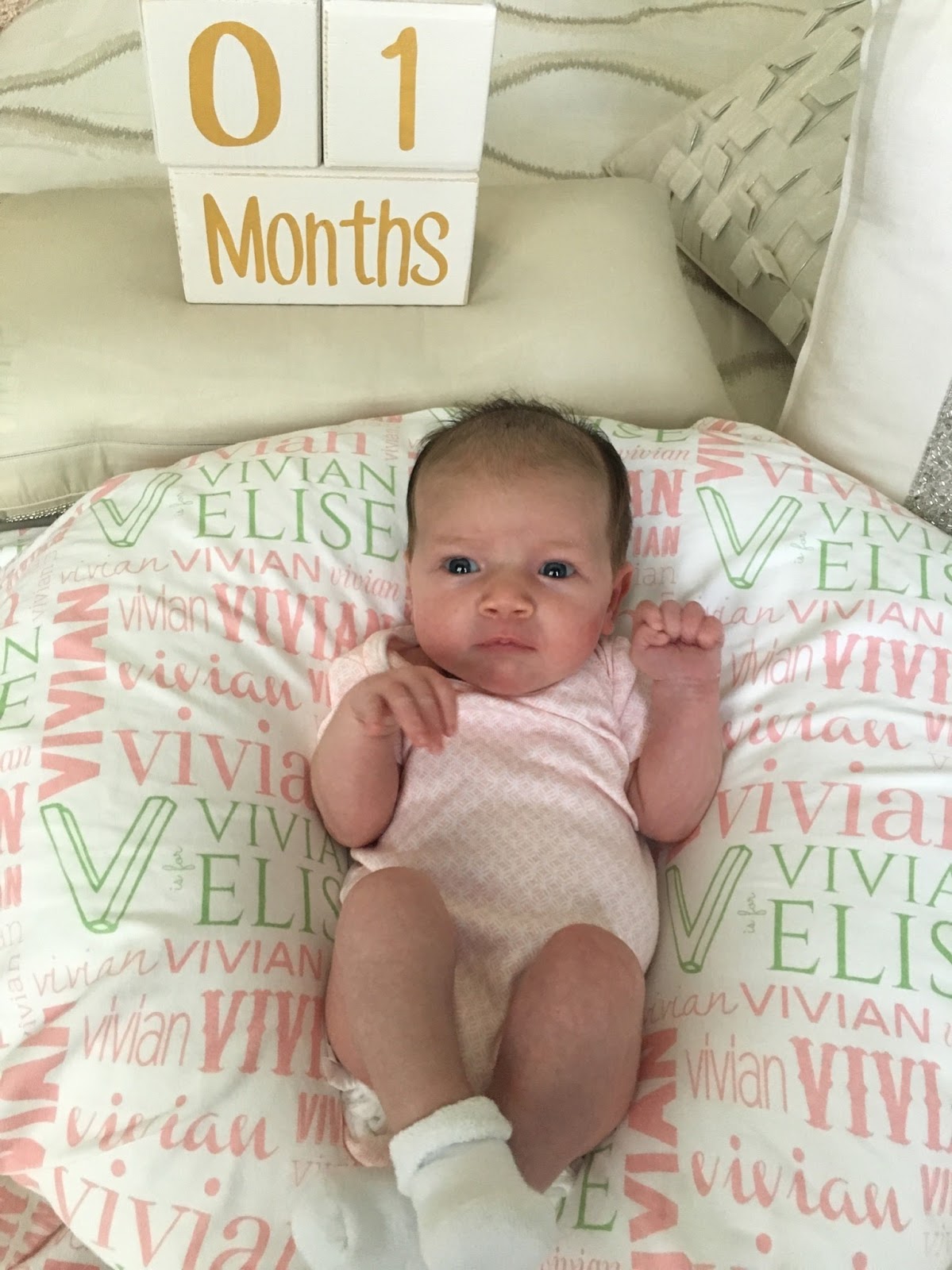 Dr. G said I could stop waking her at night. I’ve been putting her down around 7pm but waking her at 10p for a dream feed. From there she would wake up anytime from 1:30-4:30a. So, pretty sporadic, but she’s always a champ about going right back to sleep. That is, until last Sunday when she stayed up from 2:30-4:30 a.m. and not happy. Immediately my new-mommy, sleep-deprived brain assumes this is the new normal. Boy was I wrong. Since that night, Viv has slept from 10p until 6:30-7:30 a.m. That’s four nights in a row! I hate even saying it because that can’t be right, can it?? (Please be right. Please be right. Please be right.) We’re enjoying these LONG stretches while we can!