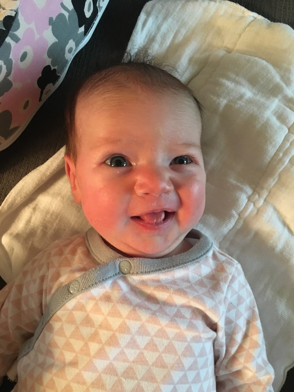 This month Vivian learned the art of smiling. While she flashed her first grin at me around 4 weeks, she’s been using her cheeky little smile to let me know she’s happy more and more. Things that make her smile are the fan, her car seat toys, mommy and daddy. Here are some of her best cheeses: