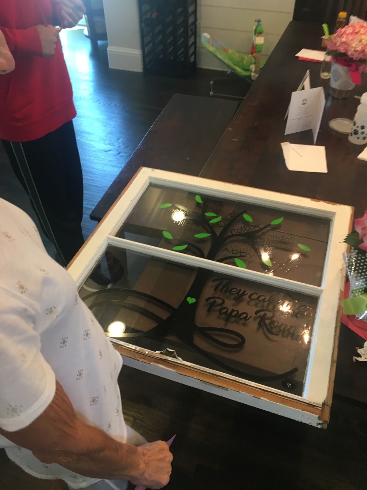 | Kathy had this amazing window made for my mom that has all of the grandkids listed on it. She’s amazing! |