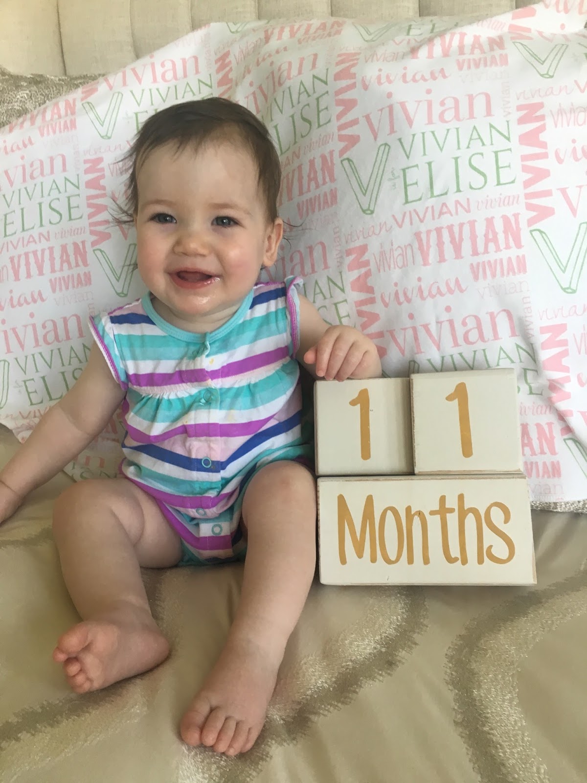 A few observations about Viv — I think we have finally admitted that she has blue eyes and they are here to stay. It’s still crazy to think this! Both Chris and I have brown eyes, so we really never saw this one coming. Also, Vivian’s hair is the darkest of all the kids. Walt had super blonde hair until he was 2 and Oscar was born with really dark hair, but it fell out and came back golden brown. Viv’s is closer to Oscar’s, but leans more brown than golden. Speaking of her hair, it’s now getting long enough to see some texture. I do not think she has the stick straight hair that belongs to Oscar. You can see her little wings sticking out. The ends of her hair are definitely wavy.